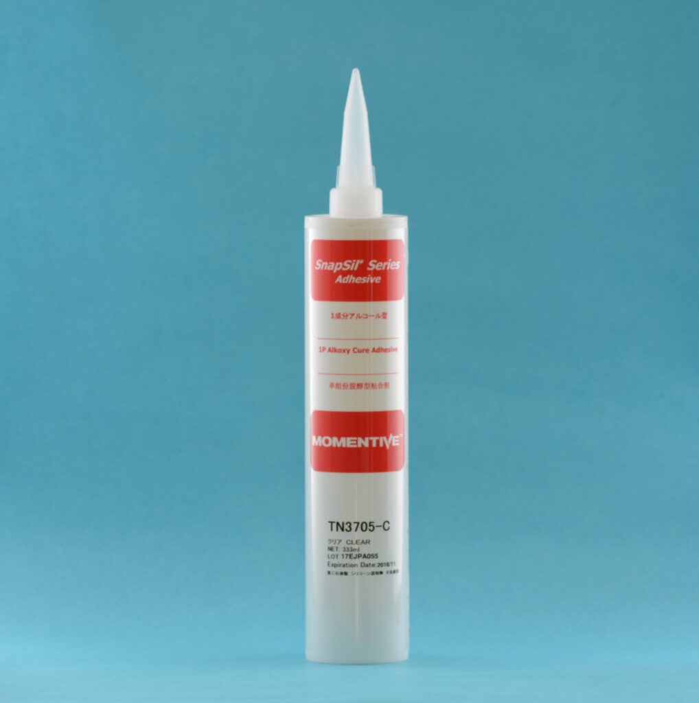 モメンティブ製「SnapSil* TN3705」は、低分子シロキサンが低減された非腐食速乾性の1成分室温硬化型の液状シリコーン 接着・シール材です。 空気中の湿気(水分)と反応し、ゴム状弾性体に硬化します。表面硬化性が速く、金属、プラスチックなどとの接着性に優れます。耐熱、耐寒性、電気絶縁性、耐候性などに優れていますので、特に電気・電子部品の接着、シール、ポッティング、コーティング材に適しています。